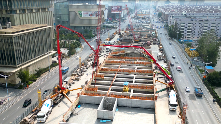 青浦新城站主体基坑长约511.2米,由北向南依次划分为五个施工区域。其中,1、3、5区基坑为一期施工,2、4区基坑为二期施工。此次完成封顶的3区基坑,处于主体基坑的中部结构标准段,长约118米,宽约51.6米。